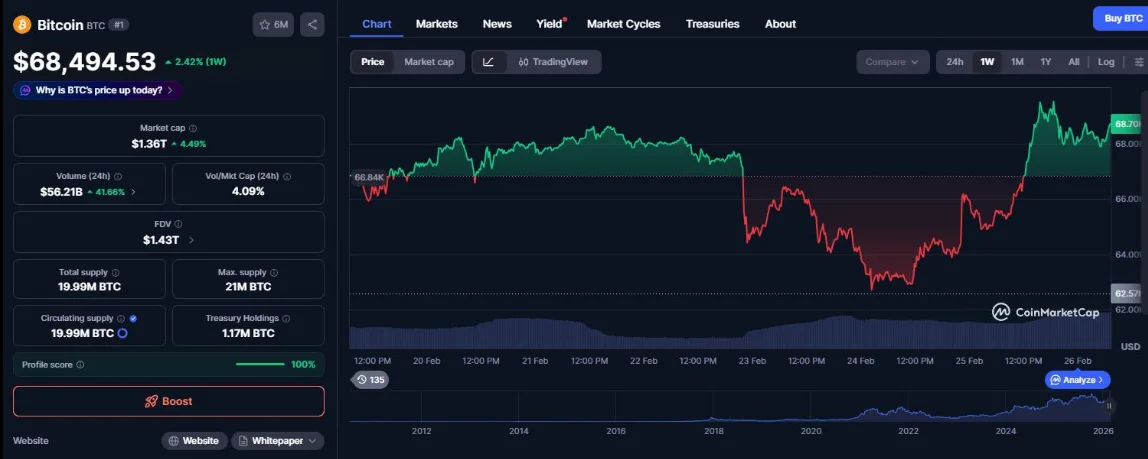 Preço do Bitcoin hoje, 26/02/2026: Por que o BTC subiu hoje? Criptomoeda supera US$ 68 mil, mas será que pode ir para US$ 70 mil?